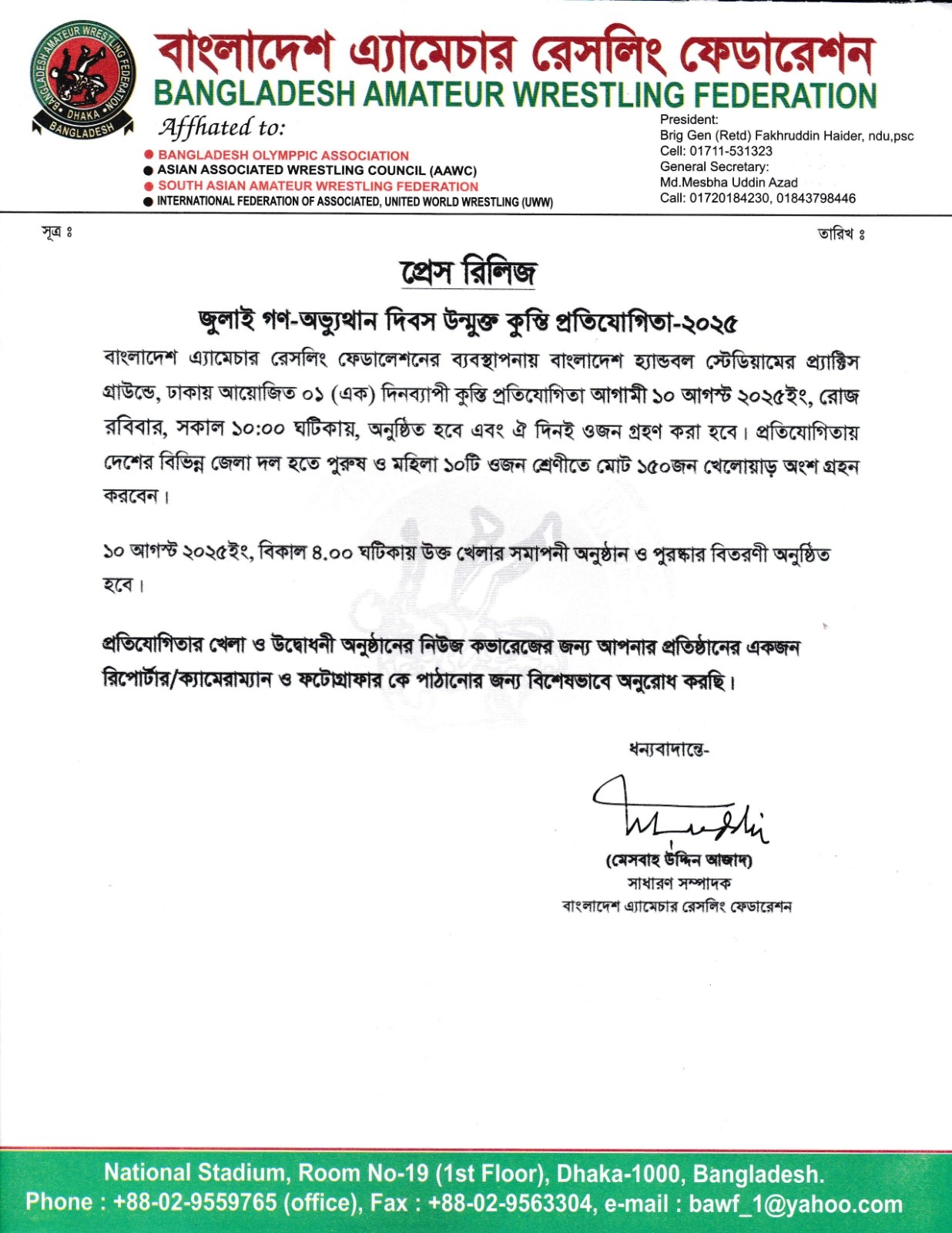 তারুণ্যের উৎসব উপলক্ষ্যে রোববার পলটনের ক্যাপ্টেন এম মনসুর আলী জাতীয় হ্যান্ডবল স্টেডিয়ামে দিনব্যাপী কুস্তি প্রতিযোগিতা অনুষ্ঠিত হবে। ছেলে ও মেয়েদের ১০টি ওজন শ্রেণীতে বিভিন্ন জেলার ১৫০ জন কুস্তিগীর পদকের জন্য লড়বেন। সকাল ১০টা থেকে শুরু হবে খেলা।